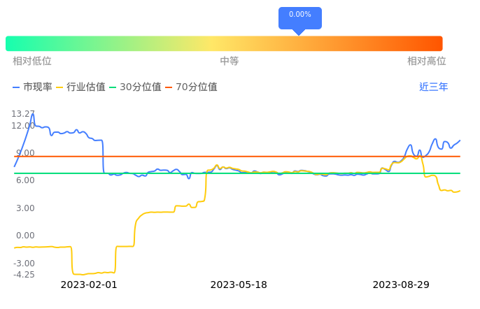 信达证券当前市现率为10.42,在所属的证券中,市现率排29,前5名分别为、申万宏源市现率1.91、兴业证券市现率2.72、东北证券市现率3.49、广发证券市现率3.68、中金公司市现率4.51。信达证券当前市现率为10.42,超过近3年0.00%的历史数据。