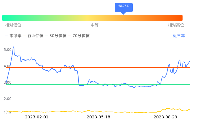 信达证券当前市净率PB为3.91,在所属的证券中,市净率PB排47,前五名分别为海通证券市净率0.81、华创云信市净率0.86、国泰君安市净率0.92、国元证券市净率0.92、华西证券市净率1.00。信达证券当前市净率PB为3.91,超过近3年68.75%的历史数据。