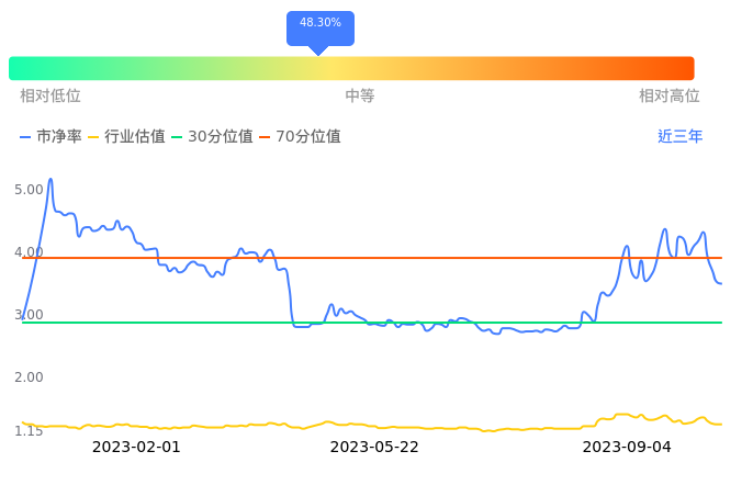 信达证券当前市净率PB为3.52,在所属的证券中,市净率PB排46,前五名分别为海通证券市净率0.78、华创云信市净率0.84、国元证券市净率0.90、国泰君安市净率0.91、哈投股份市净率0.97。信达证券当前市净率PB为3.52,超过近3年48.30%的历史数据。
