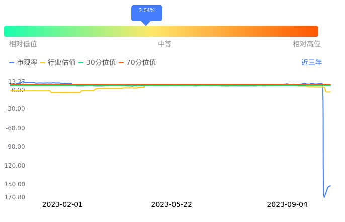 信达证券当前市现率为-152.67,在所属的证券中,市现率排23,前5名分别为、申万宏源市现率1.82、兴业证券市现率2.67、东北证券市现率3.43、广发证券市现率3.87、国泰君安市现率4.62。信达证券当前市现率为-152.67,超过近3年2.04%的历史数据。