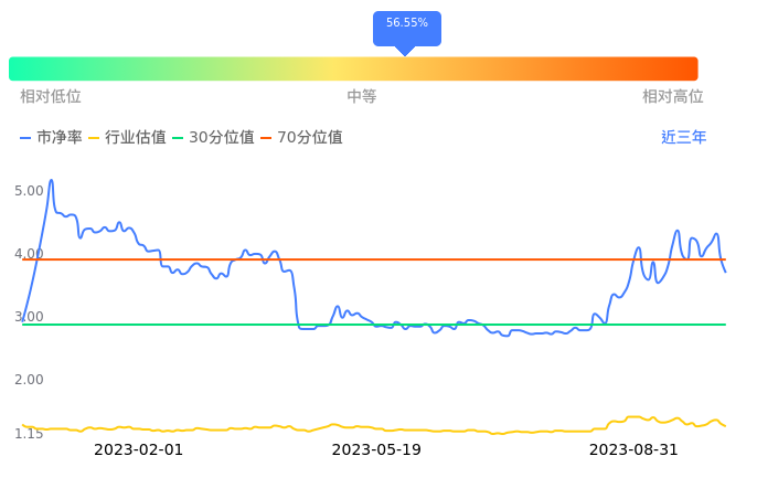 信达证券当前市净率PB为3.70,在所属的证券中,市净率PB排47,前五名分别为海通证券市净率0.77、华创云信市净率0.83、国元证券市净率0.90、国泰君安市净率0.91、华泰证券市净率0.97。信达证券当前市净率PB为3.70,超过近3年56.55%的历史数据。