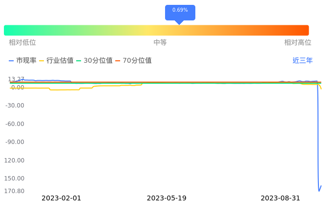 信达证券当前市现率为-161.44,在所属的证券中,市现率排23,前5名分别为、申万宏源市现率1.82、兴业证券市现率2.68、东北证券市现率3.43、广发证券市现率3.84、华泰证券市现率4.55。信达证券当前市现率为-161.44,超过近3年0.69%的历史数据。
