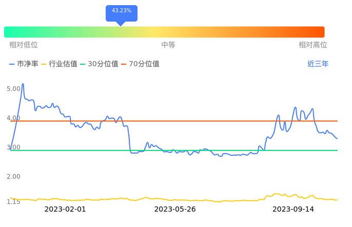 信达证券当前市净率PB为3.30,在所属的证券中,市净率PB排46,前五名分别为海通证券市净率0.80、国元证券市净率0.90、华创云信市净率0.90、国泰君安市净率0.93、华西证券市净率0.97。信达证券当前市净率PB为3.30,超过近3年43.23%的历史数据。