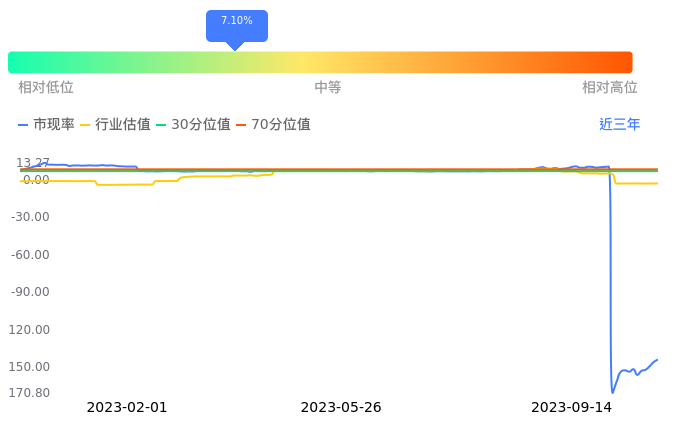 信达证券当前市现率为-144.07,在所属的证券中,市现率排23,前5名分别为、申万宏源市现率1.82、兴业证券市现率2.68、东北证券市现率3.39、广发证券市现率3.84、国泰君安市现率4.68。信达证券当前市现率为-144.07,超过近3年7.10%的历史数据。