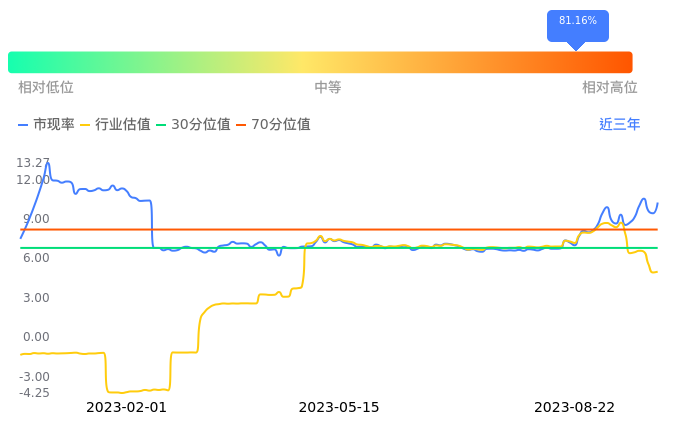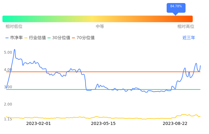信达证券当前市净率PB为4.29,在所属的证券中,市净率PB排47,前五名分别为海通证券市净率0.82、华创云信市净率0.87、国元证券市净率0.94、国泰君安市净率0.96、华泰证券市净率1.05。信达证券当前市净率PB为4.25,超过近3年84.78%的历史数据。