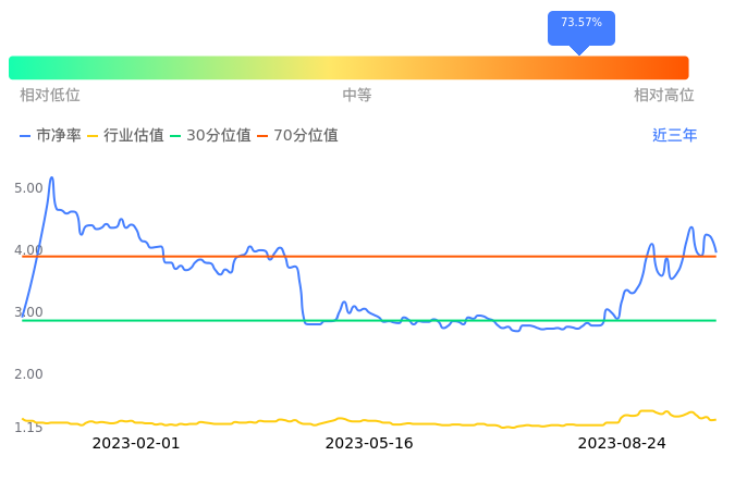 信达证券当前市净率PB为4.13,在所属的证券中,市净率PB排47,前五名分别为海通证券市净率0.80、华创云信市净率0.86、国元证券市净率0.91、国泰君安市净率0.95、华西证券市净率1.01。信达证券当前市净率PB为4.08,超过近3年73.57%的历史数据。