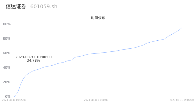 601059信达证券2023年08月31日成交72.57万手,成交金额14.31亿元,相较昨日缩量22.85万手,换手率22.38%,成交活跃。
