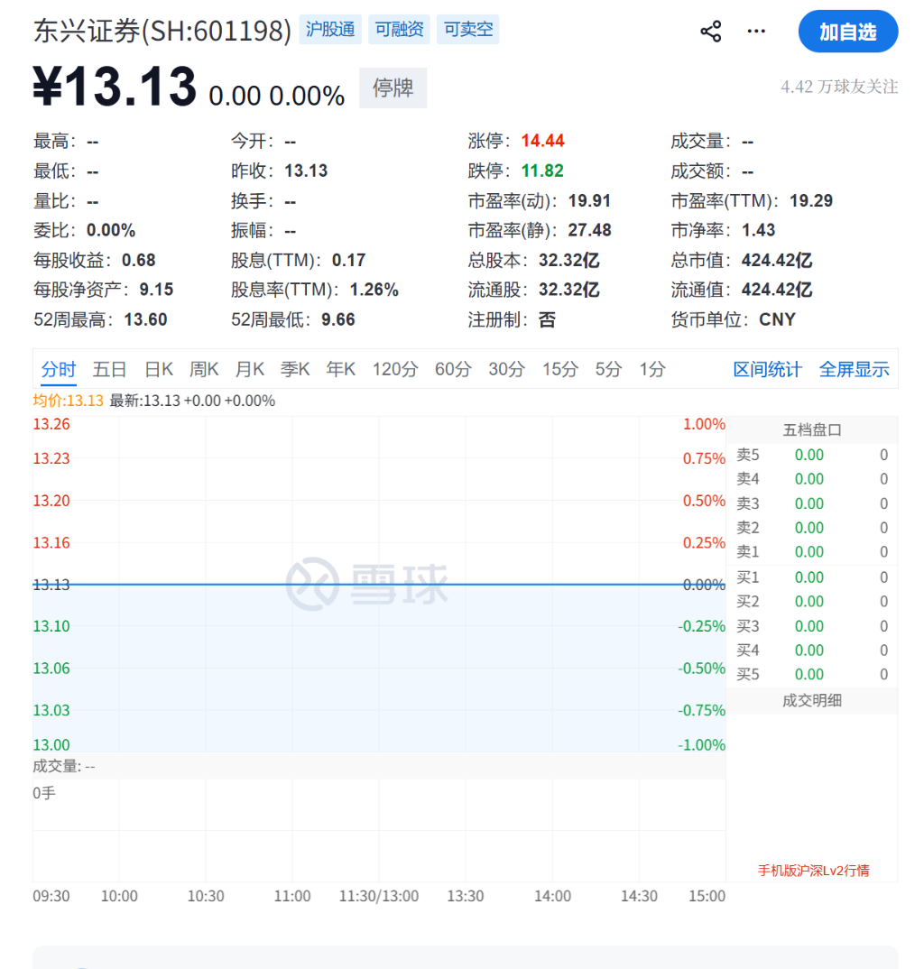 东兴证券股价现报13.13元/股。信达证券现报17.79元/股。