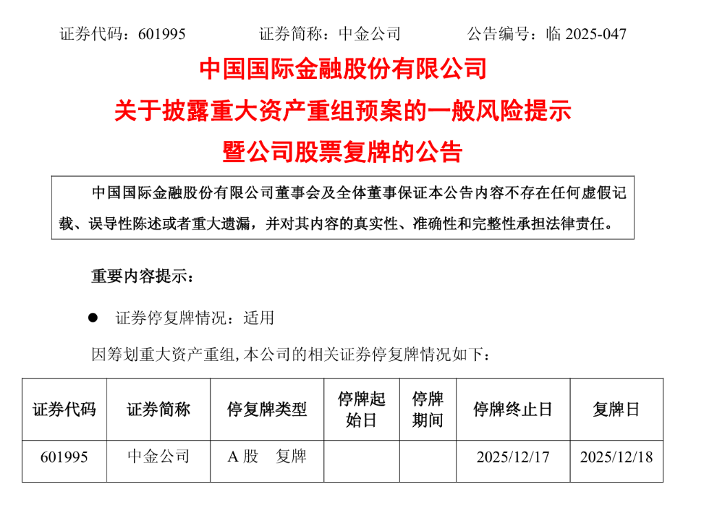 据华尔街见闻此前文章,11月19日,汇金系券商版图就酝酿重大重组。中金公司曾表示,本次重组有助于加快建设一流投资银行,支持金融市场改革与证券行业高质量发展。如今备受关注的合并预案方案终于出台,要早于原预计复牌时间。