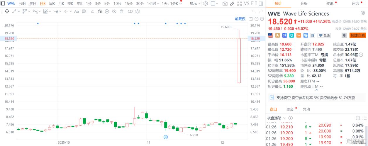 同日(12月8日),美股公司硕迪生物和Wave生命科学也公布其重要候选药物的临床研究数据,双双引爆股价。