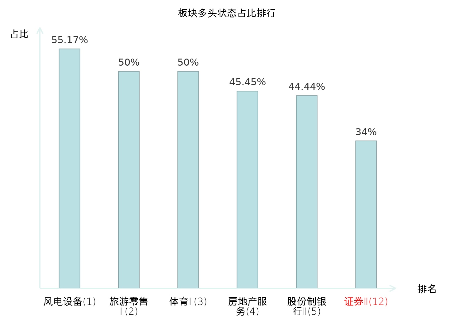 全市场所有行业板块中主力多头状态占比排名中,风电设备板块位居第一。保险Ⅱ板块名次提升最快,较昨日上升64位。