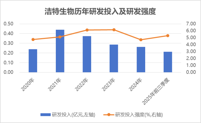 财务数据显示,上市以来(2020年至2024年),洁特生物保持年均超过3000万元的研发投入,用于生物实验室耗材产品扩产及技术升级改造、生物实验室耗材产线升级智能制造等项目。2020年至2024年,公司研发投入强度稳居4.5%以上,2025年前三季度达到5.3%。