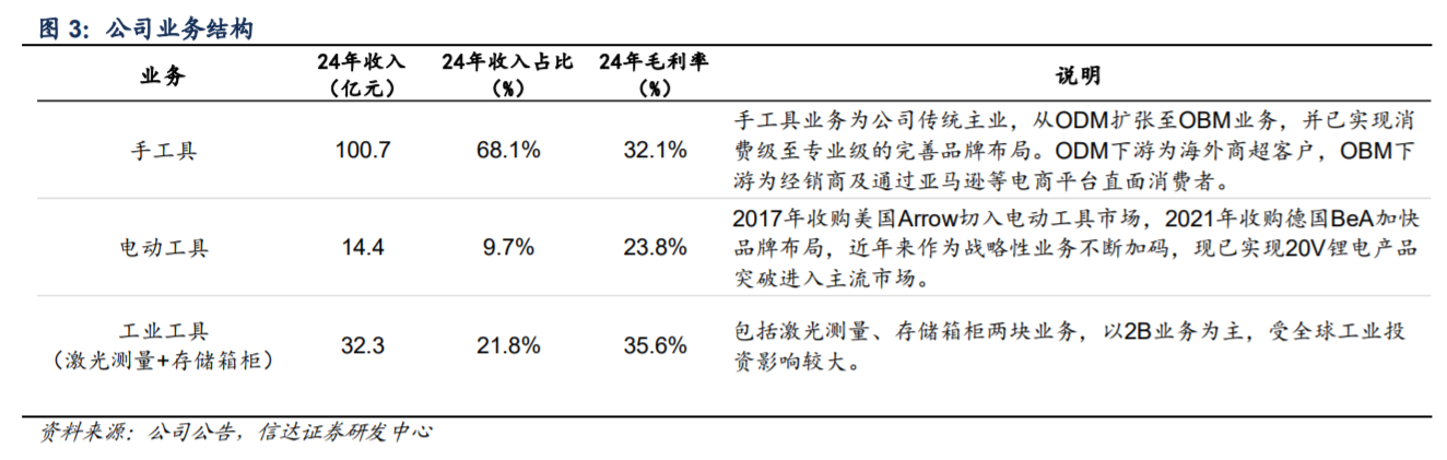 3.2017年至今,转型OBM,内生外延并举:2017年开始公司启动OBM转型,开启大规模品牌并购以扩充品牌矩阵、切入新兴品类。2017年公司收购美国知名气动工具品牌Arrow进入电动工具领域,2018年收购Lista欧洲业务进入工具存储箱柜领域,后继续收购Swiss+Tech、Shop-Vac、BeA等多个海外品牌补充细分品类布局,形成手工具+电动工具+激光测量+存储箱柜的产品结构。在此期间,公司自创的自主品牌亦成功拓展跨境电商渠道,在亚马逊平台开设店铺实现快速增长。2016-2023年,在聚焦主业战略指引下,公司通过内生外延扩张实现快速增长,OBM业务收入占比由不足10%提升至接近50%,成功实现转型。