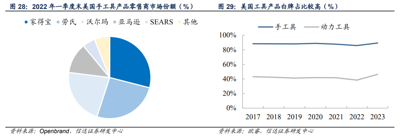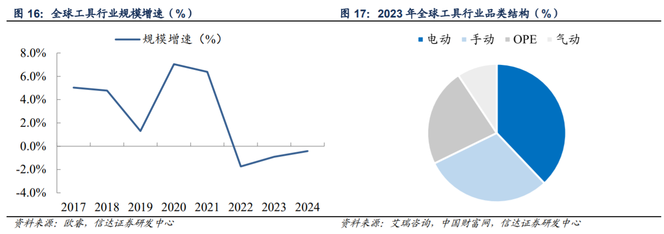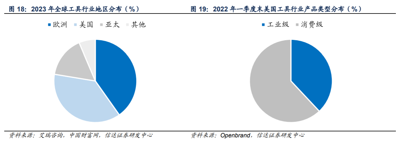 景气周期底部,市场份额有提升空间。全球工具行业规模超千亿美元,其中手工具/动力工具占比分别约30%/38%,终端场景主要为欧美消费者房屋维修及汽修,DIY消费级产品占比较高,具有耐用消费品属性。