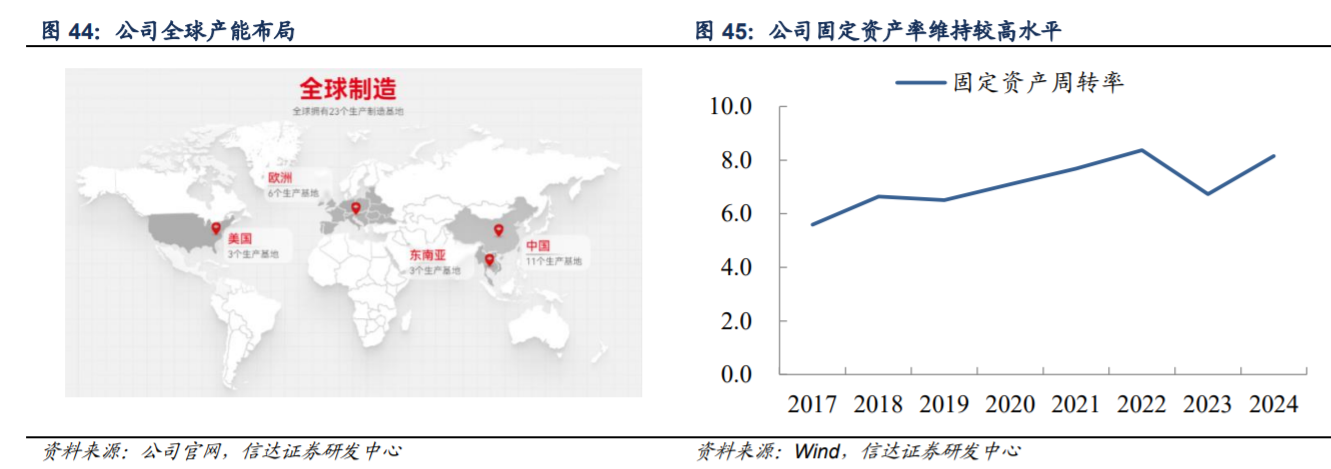 2.生产:坚持创新驱动,研发费用长期近3.0%,高频创新迭代切入新市场。2018年后已布局全球23个产能基地,降低成本规避高关税。