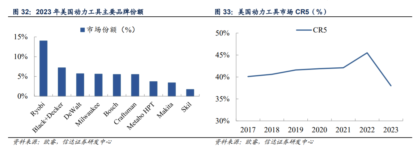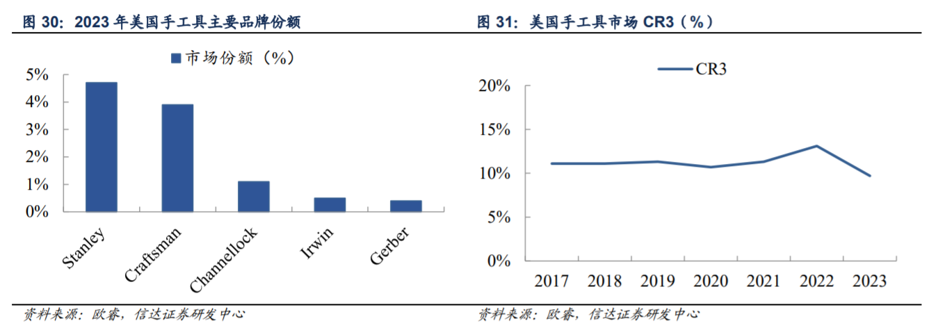 2)竞争维度:工具行业下游零售商议价能力强,上游制造竞争激烈,导致品牌份额相对分散。ODM模式重渠道绑定,比拼成本;OBM模式则重品牌资源,壁垒显著。公司近年来积极搭建品牌矩阵,探索跨境电商渠道培育自有品牌,市场份额有提升空间。