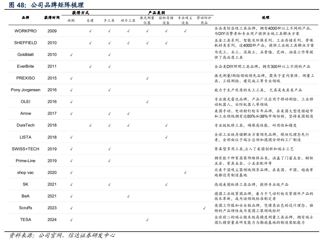 “聚焦主业,创新产品,运营品牌,布局全球”的战略指引下,未来公司仍将继续品牌发展为核心,继承和发展现有国际知名工具品牌矩阵、同时发展适应新时代的电商工具品牌。截至2024年,公司拥有近68.5亿元货币资金,在手资金充裕足以支撑潜在的品牌收购计划,产业并购仍大有可为。