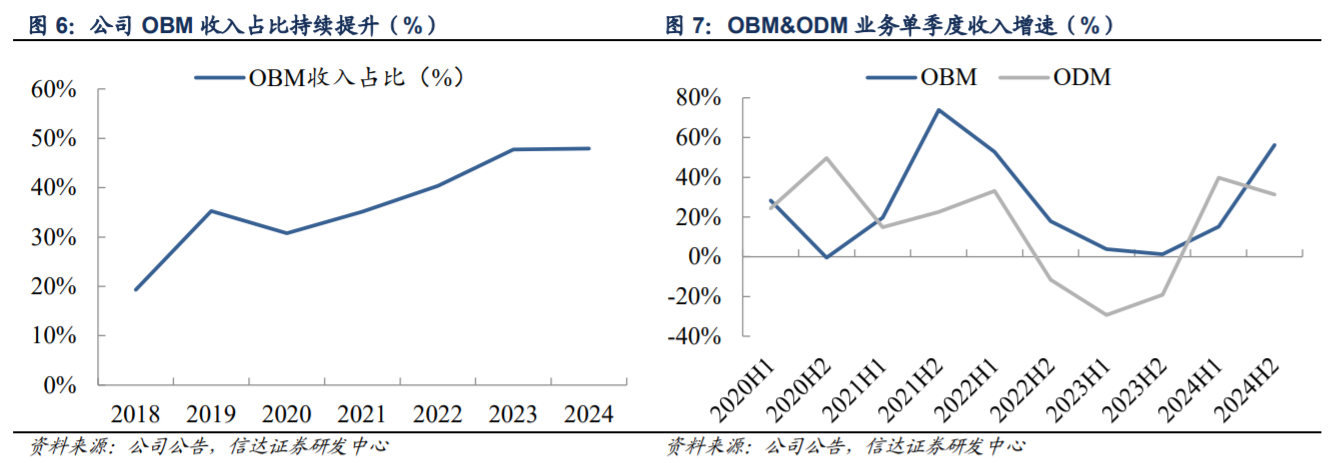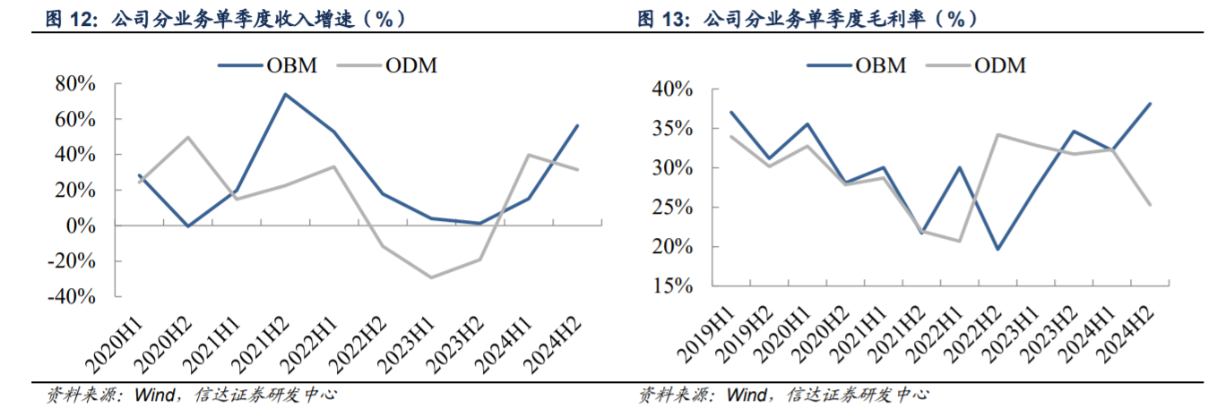 坚定推进自主品牌战略,通过外延并购和自主孵化完善品牌矩阵,OBM业务发展卓有成效。2018年开始OBM收入占比进入持续上升通道,截至2024年已达到47.9%。OBM业务拓展一方面有助于利润率提升,另一方面通过直面消费者能平抑业绩波动。2020年开始OBM季度收入同比增速整体高于ODM并且在2022-2023年行业需求底部仍能维持正增长。
