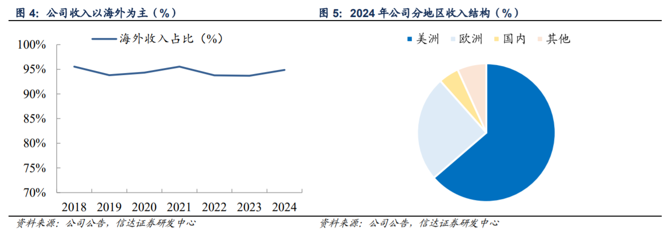 海外业务为主,北美市场占比超60%。公司自成立之初即以海外业务为主,并且手工具及后续拓展的电动工具等品类主要消费市场位于欧美,因公司主要市场位于海外,2018-2024年海外收入占比均值94.5%,2024年继续保持在94.9%的高位。具体地区分布上,以美国为主的美洲地区是绝对大头,2024年收入占比约63.4%,因此美国需求变动对公司业务有较大影响;其次是前期收购Lista、BeA等品牌承接销售渠道和客户体系所进入的欧洲市场,2024年占比约24.6%;此外,公司积极拓展一带一路国家市场,目前占比相对较小。