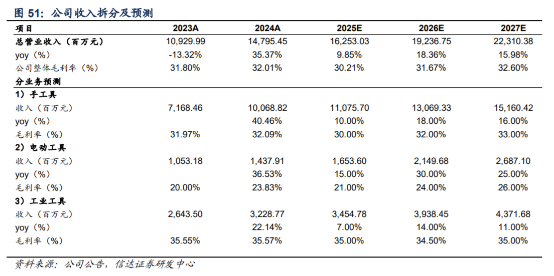 工业工具:工业工具受全球工业投资影响较大,且欧洲经济复苏相对缓慢,但公司积极进行产品创新及开拓一带一路国家新市场,预计仍能实现增长。预计2025-2027年工业工具收入增速分别为7%/14%/11%,毛利率分别为35.0%/34.5%/35.0%。