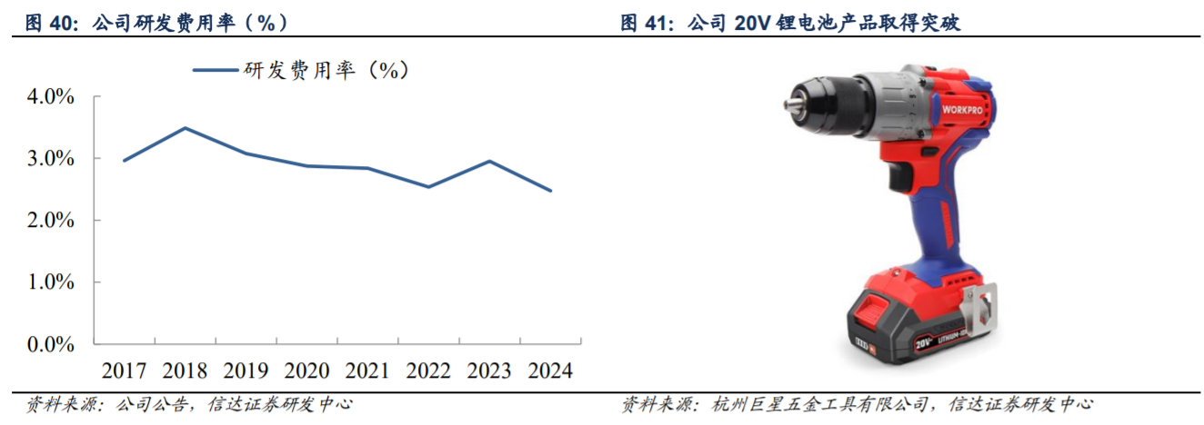 中国工具出海龙头,看好长期份额提升。公司作为中国工具出海龙头,坚持“聚焦主业,创新产品,运营品牌,布局全球”战略,具备渠道客户绑定、产品创新能力、自有品牌矩阵、全球产能布局等竞争优势。近年来公司积极拓展跨境电商、电动工具产品业务探索渠道和品类增量,提升市场份额,2024年公司手工具全球市占率6.1%、工具全球市占率2.1%。长期来看,随着全球产业链重构完成,公司凭借领先的产品渠道布局、东南亚产能释放,全球份额有望进一步提升。