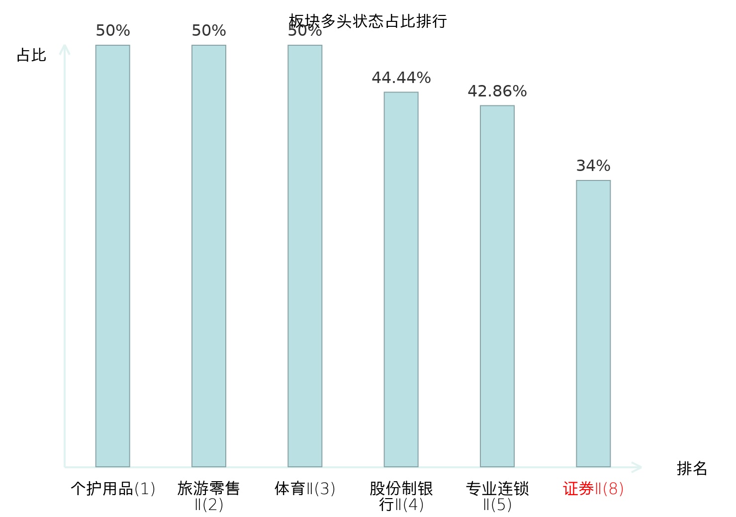 全市场所有行业板块中主力多头状态占比排名中,个护用品板块位居第一。非金属材料Ⅱ板块名次提升最快,较昨日上升37位。