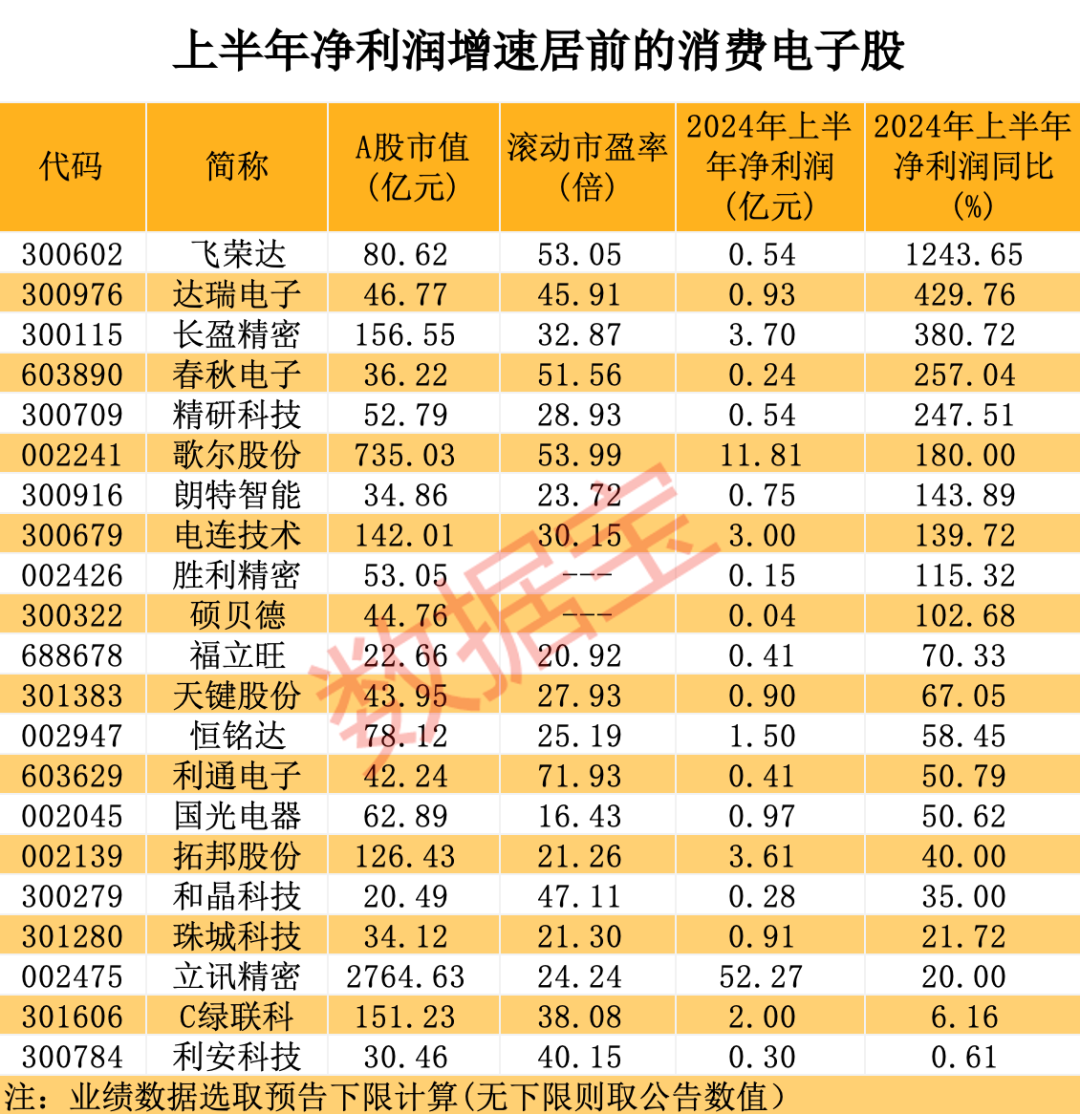据证券时报·数据宝统计,按照业绩预告净利润下限(无下限则取公告数值)计算,消费电子行业上市公司中,今年上半年净利润同比增长(含扭亏为盈)的公司有21家,占已披露公司数量的六成以上。飞荣达、长盈精密、春秋电子等净利润增速居前。
