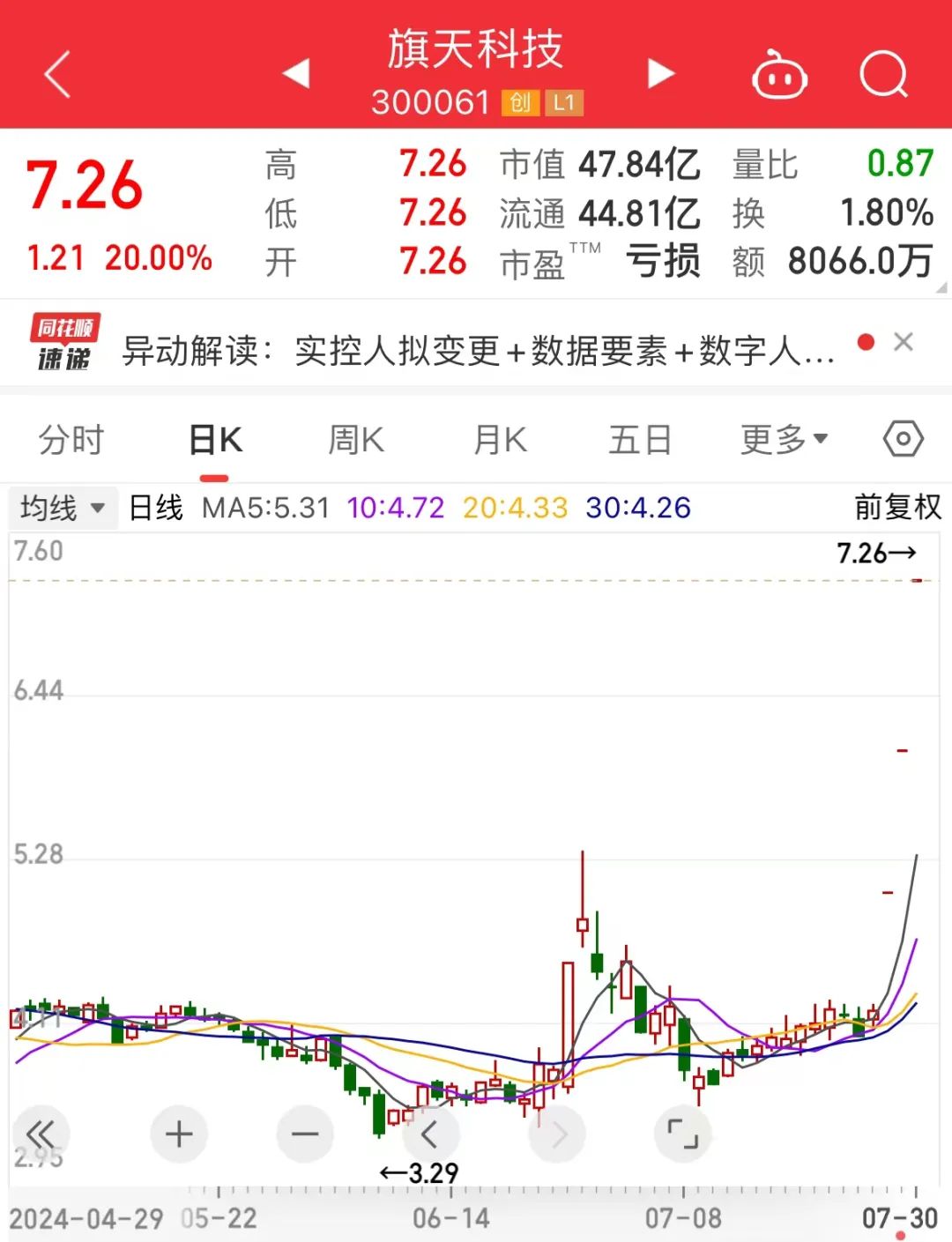 7月30日早盘,旗天科技再次一字涨停,涨停板封单一度超过24万手,这是该股连续第三个“20cm”的涨停板。在此番大涨之前,公司股价已处在十年来低点区间。在收获3个涨停板之后,公司股价回到7.26元/股,最新A股市值逼近50亿元。