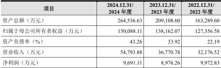 财务方面,于2022年度、2023年度及2024年度,公司实现营业收入分别约为人民币3.22亿元、3.68亿元、5.48亿元;同期,公司净利润分别为人民币9972.83万元、8976.26万元、9691.11万元。