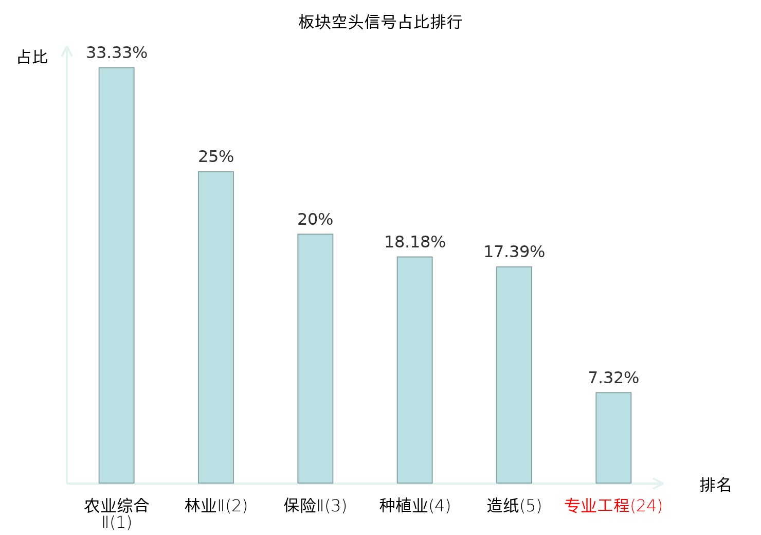 全市场所有行业板块中主力空头信号占比排名中,农业综合Ⅱ板块位居第一。炼化及贸易板块名次提升最快,较昨日上升115位。