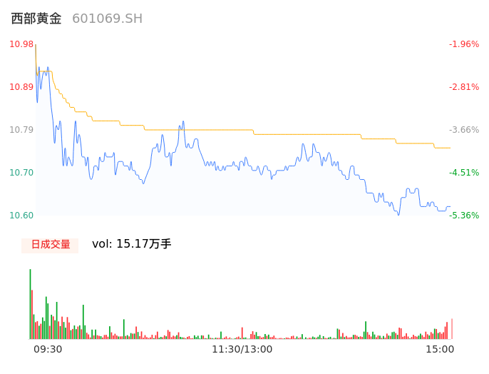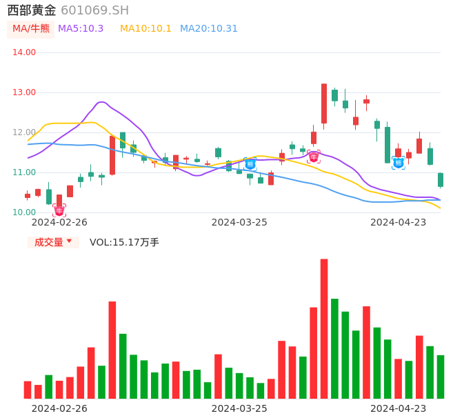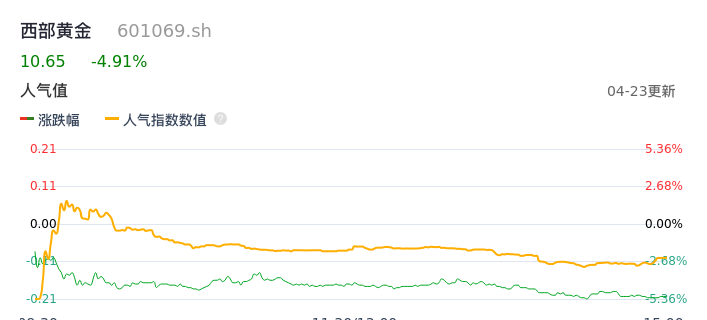 04月23日,西部黄金收报10.65,股价涨幅-4.91%,成交金额1.63亿元,换手率2.22%。