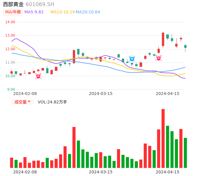 04月15日,西部黄金收报12.10,股价涨幅-5.62%,成交金额3.00亿元,换手率3.63%。