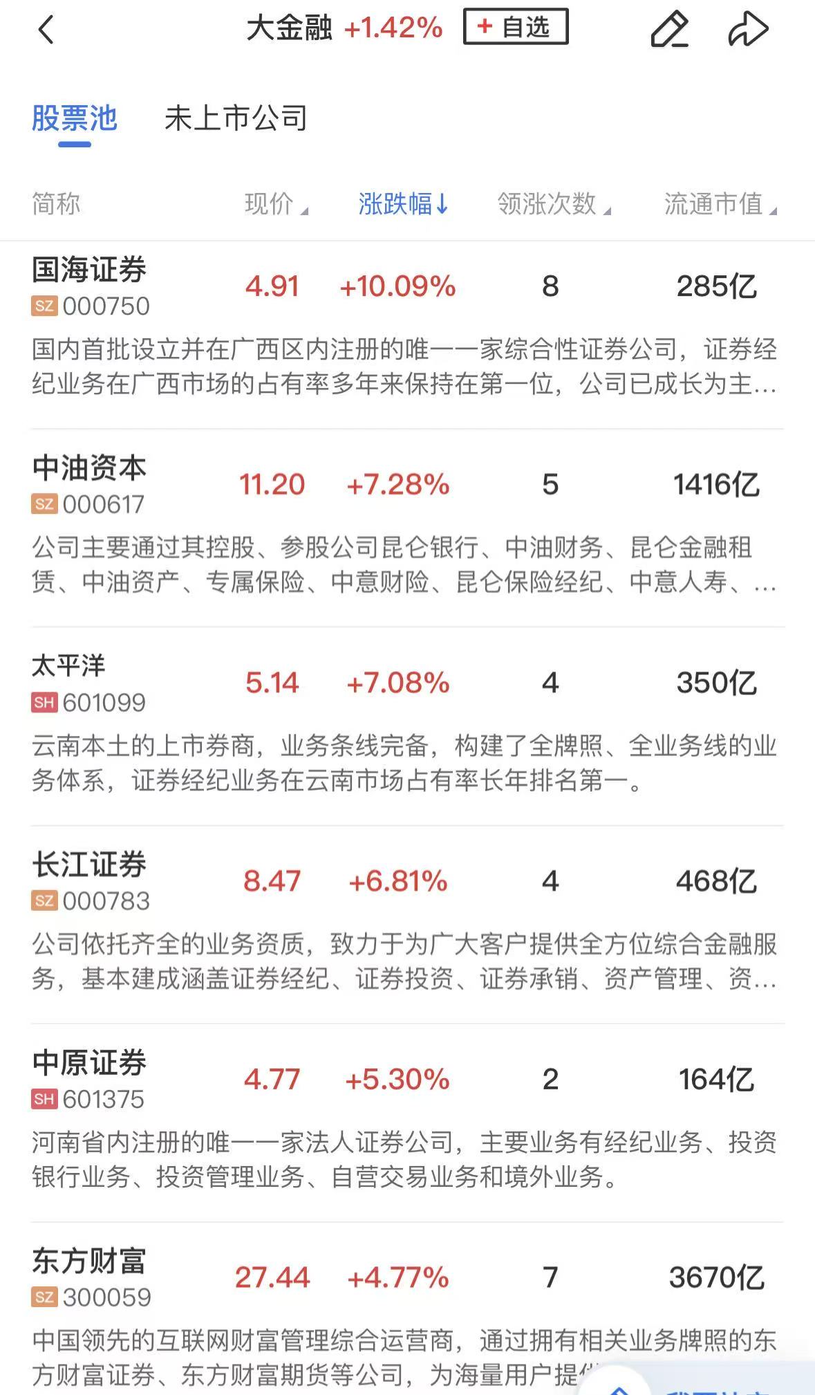 大金融板块表现活跃,国海证券涨停,指南针、太平洋、长江证券、大智慧等涨幅居前。