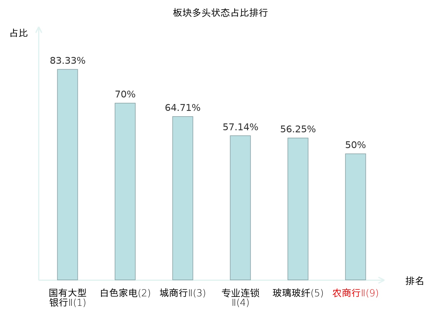全市场所有行业板块中主力多头状态占比排名中,国有大型银行Ⅱ板块位居第一。食品加工板块名次提升最快,较昨日上升51位。