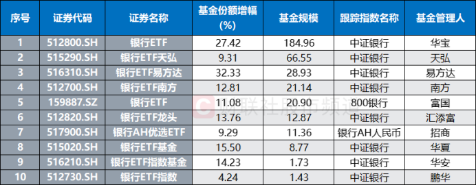 相关ETF方面,10只银行系ETF本月份额均有不同程度增长。截至10月15日,基金规模最大的银行ETF(512800)目前份额达228.15亿份,月内份额增长近27.42%,同时创上市以来新高。其余ETF方面,银行ETF易方达(516310)、银行ETF(512800)份额增长幅度较高,分别达32.33%、27.42%,而银行ETF指数(512730)等份额增幅相对较小。