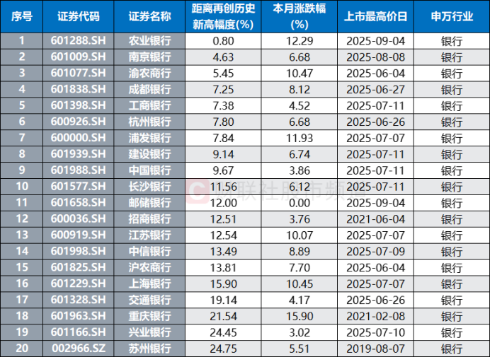 受近期持续修复提振,不少此前大幅回调的银行股目前股价再度回升至历史高位。以距离再创历史新高需要的涨幅统计,农业银行仅差0.8个百分点,南京银行、渝农商行、成都银行、工商银行、杭州银行等共8股距离创新高也已不足10%。其中,农业银行目前已实现7日连涨,并录得10连阳,成都银行、厦门银行、长沙银行、苏农银行、西安银行则为6连涨。