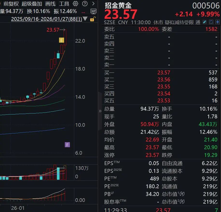 贵金属概念股爆发,其中招金黄金(000506)拉升涨停,近7个交易日5度涨停。
