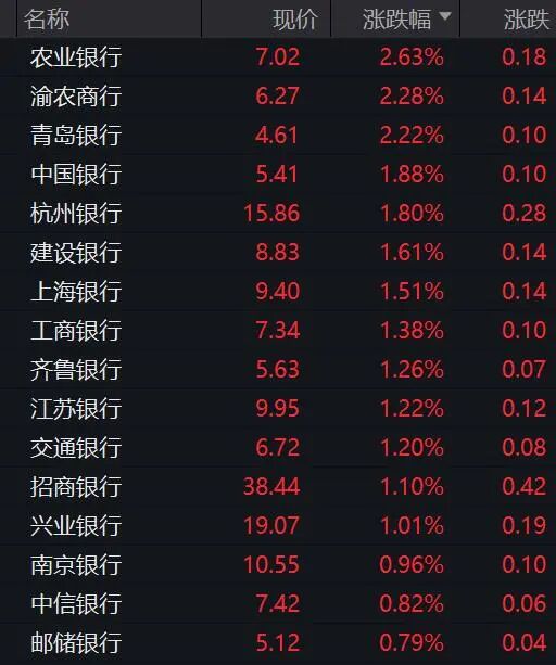AH银行股早间也联袂走强,A股银行板块指数高开高走涨逾1%,农业银行、渝农商行、青岛银行、中国银行等涨幅居前。