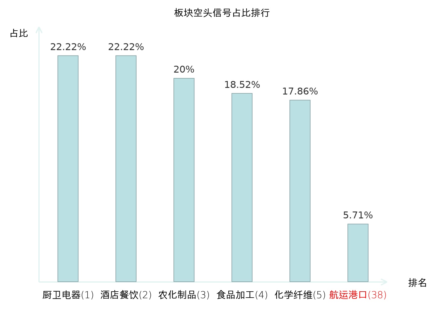 全市场所有行业板块中主力空头信号占比排名中,厨卫电器板块位居第一。化学纤维板块名次提升最快,较昨日上升119位。