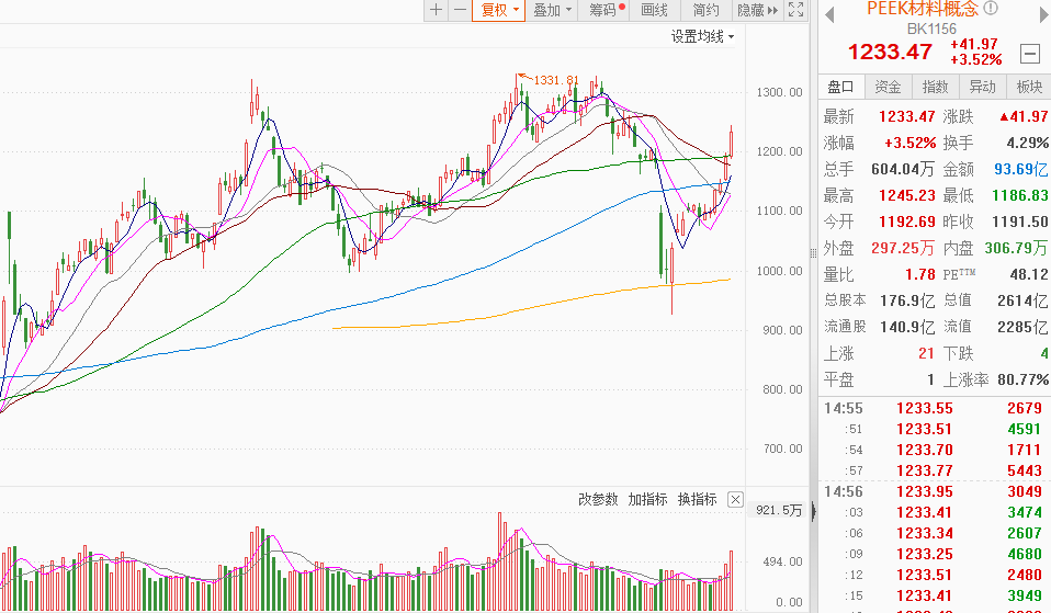 事件驱动:消息面上,国金证券研报表示,随着人形机器人迎来量产元年,上游核心化工新材料也将从中持续受益,其中包括高端工程塑料包含聚醚醚酮(PEEK)、聚酰胺(PA)、聚苯硫醚(PPS)、液晶聚合物(LCP)、热塑性弹性体(TPE)和超高分子量聚乙烯(UHMW-PE)等。PEEK材料概念股震荡走高,新瀚新材、肇民科技20CM涨停,富恒新材涨超10%,中广核技、中欣氟材涨停,中研股份、华密新材、南京聚隆、沃特股份、聚赛龙等跟涨。