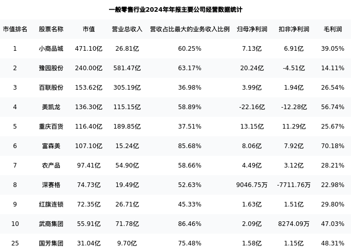 国芳集团最新报告期数据为年报,下表汇总了一般零售行业内市值靠前的公司年报主要经营数据