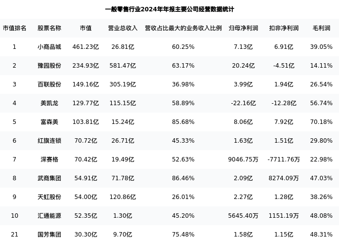 国芳集团最新报告期数据为年报,下表汇总了一般零售行业内市值靠前的公司年报主要经营数据