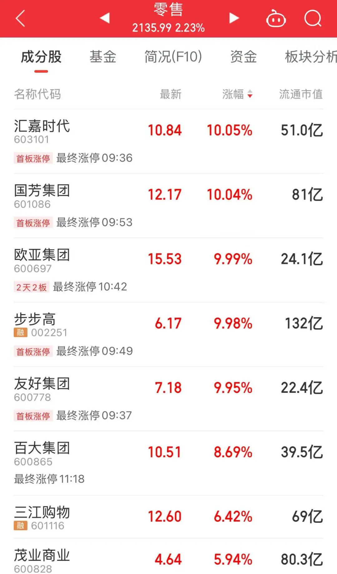 今天上午,新能源赛道和大消费赛道表现活跃。具体来看,大消费赛道走势较强,旅游酒店、零售、免税店等板块涨幅居前。汇嘉时代、国芳集团等多股涨停。