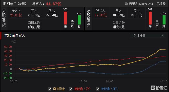 今日,南向资金净买入44.67亿港元,其中港股通(沪)净买入26.61亿港元,港股通(深)净买入17.86亿港元。