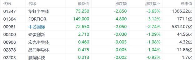 半导体股跌幅居前,华虹半导体跌超3%,中芯国际跌超2%,宏光半导体、晶门半导体跌超1%。消息面上,台积电10月营收同比上升16.9%,增速为2024年2月以来最低水平,不过仍略高于市场预期的16%。近期,科技板块出现明显回调,台积电增长势头有所放缓,引发市场对人工智能领域发展持续性的关注。尽管多家科技企业仍在积极争取芯片产能,这一趋势仍令部分投资者对行业前景保持谨慎。