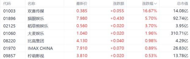 影视股上涨,欢喜传媒大涨超16%,猫眼娱乐涨超5%。消息上,灯塔专业版数据显示,截至11月10日,2025年电影市场总票房已经达到了450.18亿元。接下来的一个多月时间内,还将有4部引进片上映,有望助力全年票房突破500亿元。花旗近期研报指出,对猫眼娱乐开启30日正面催化剂观察,驱动因素为主要动画电影《鬼灭之刃》预定于11月14日上映,由猫眼担任其发行商。