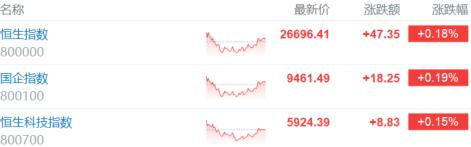 截止收盘,恒生指数涨0.18%报26696点,国企指数涨0.19%,恒生科技指数涨0.15%,市场情绪总体表现平稳。