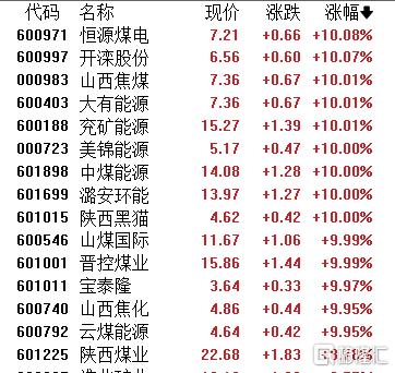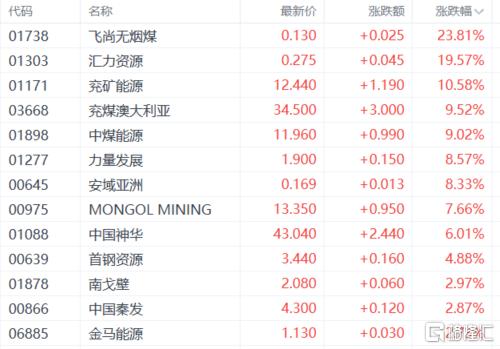 港股市场同样表现不俗,煤炭股强势走高。截至发稿,兖矿能源、兖煤澳大利亚、中煤能源、力量发展等主要煤炭股均录得大幅上涨。