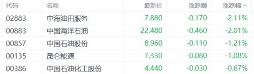 石油股低迷,中海油田服务中国海洋石油跌超2%,中国石油股份昆仑能源中国石油化工股份等跟跌。