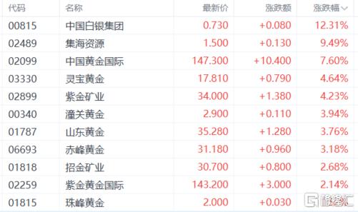 黄金股走强,中国白银集团涨超12%,中国黄金国际灵宝黄金紫金矿业潼关黄金山东黄金赤峰黄金等跟涨。